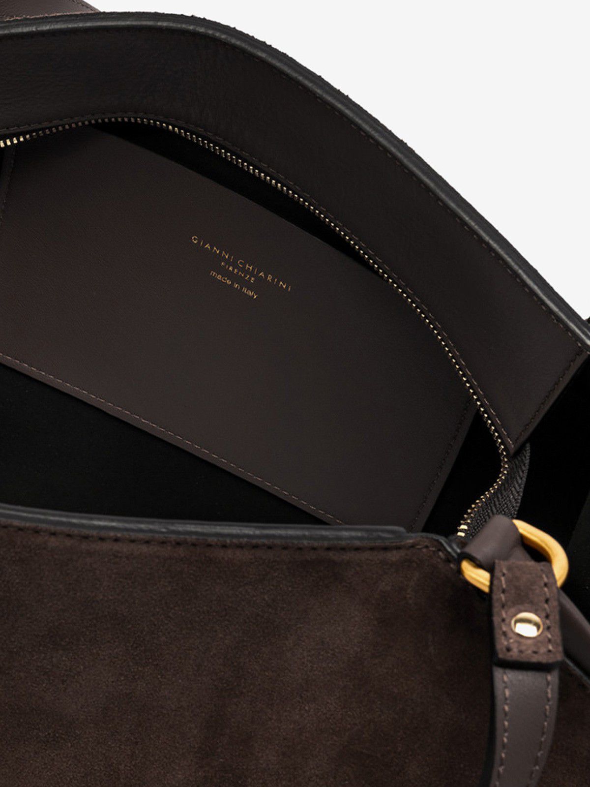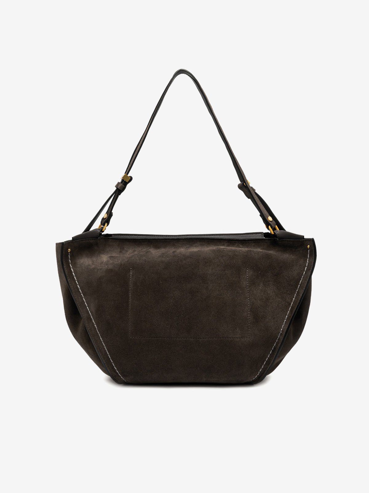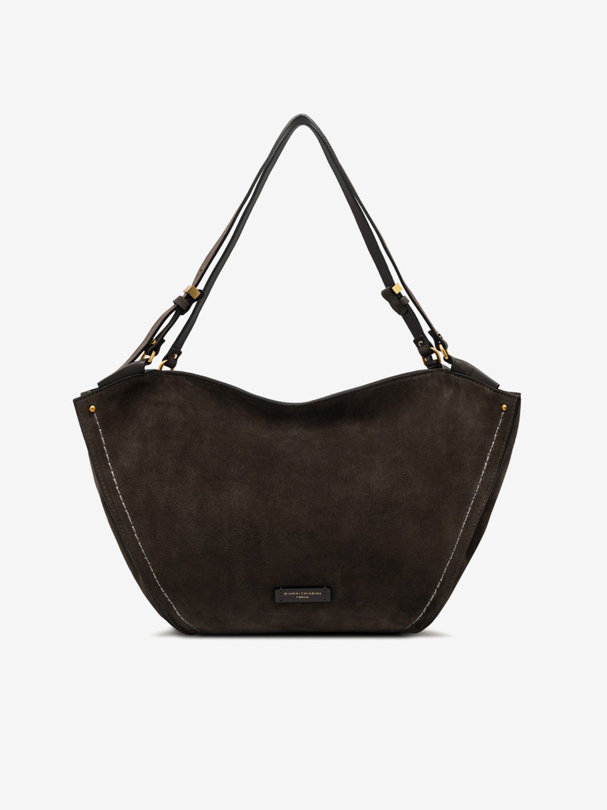 Bloom è la nuova borsa pratica e capiente, caratterizzata da una shape a tulipano. Realizzata in pelle scamosciata ed impreziosita da una cucitura decorativa a contrasto. L'accessorio è arricchito da elementi in metallo che donano alla borsa un tocco di lucentezza. Dimensioni: 43x25x14 cm