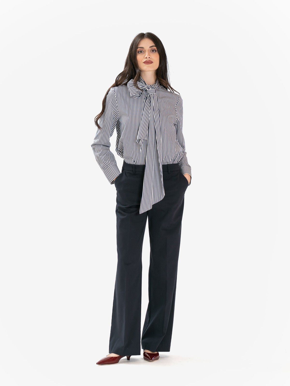 Camicia in cotone oversize con sciarpetta a righe bianca e blu.
