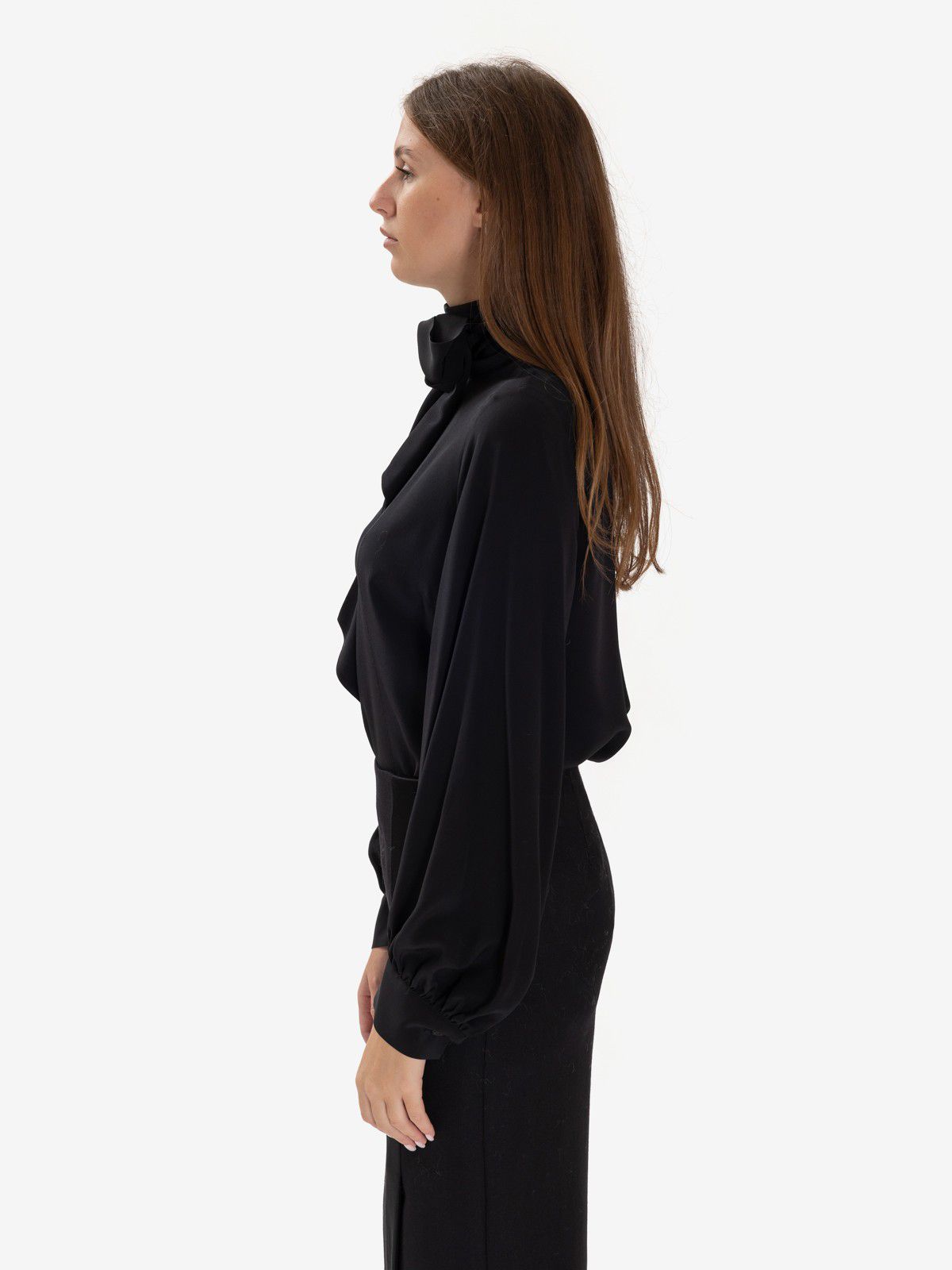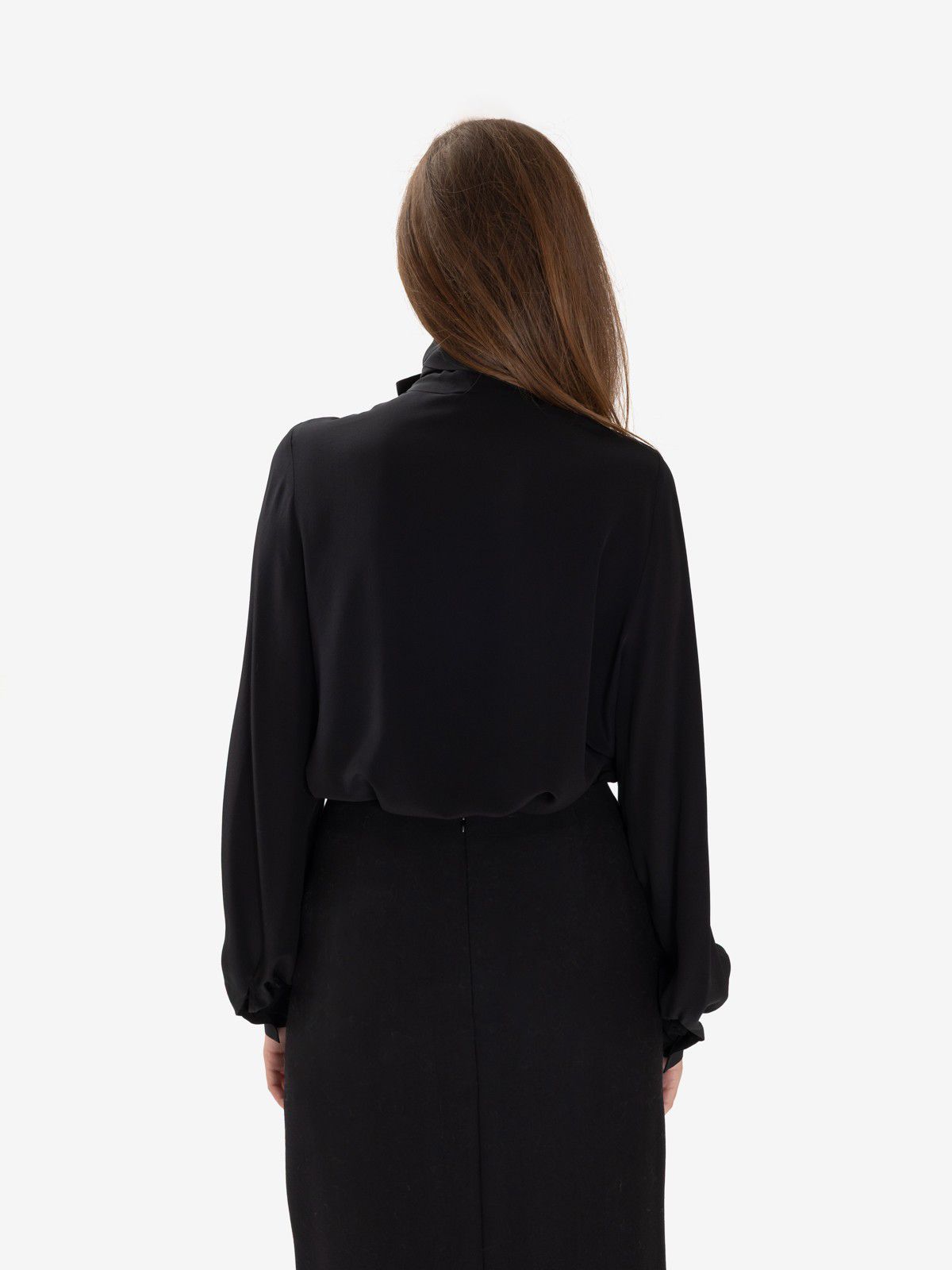 Camicia in seta nera con sciarpetta e maniche a palloncino.