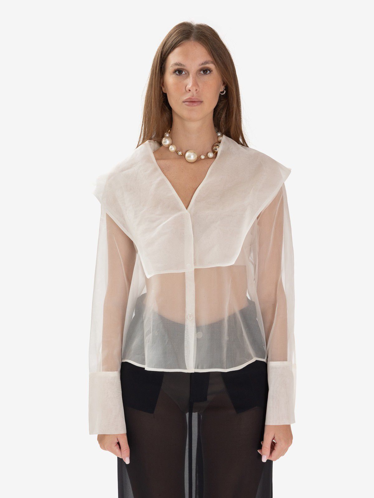 CAMICIA IN ORGANZA DI SETA CON COLLO BAVERO OVERSIZE, ALLACCIATURA CENTRALE, MANICA LUNGA CON POLSINO OVER.
