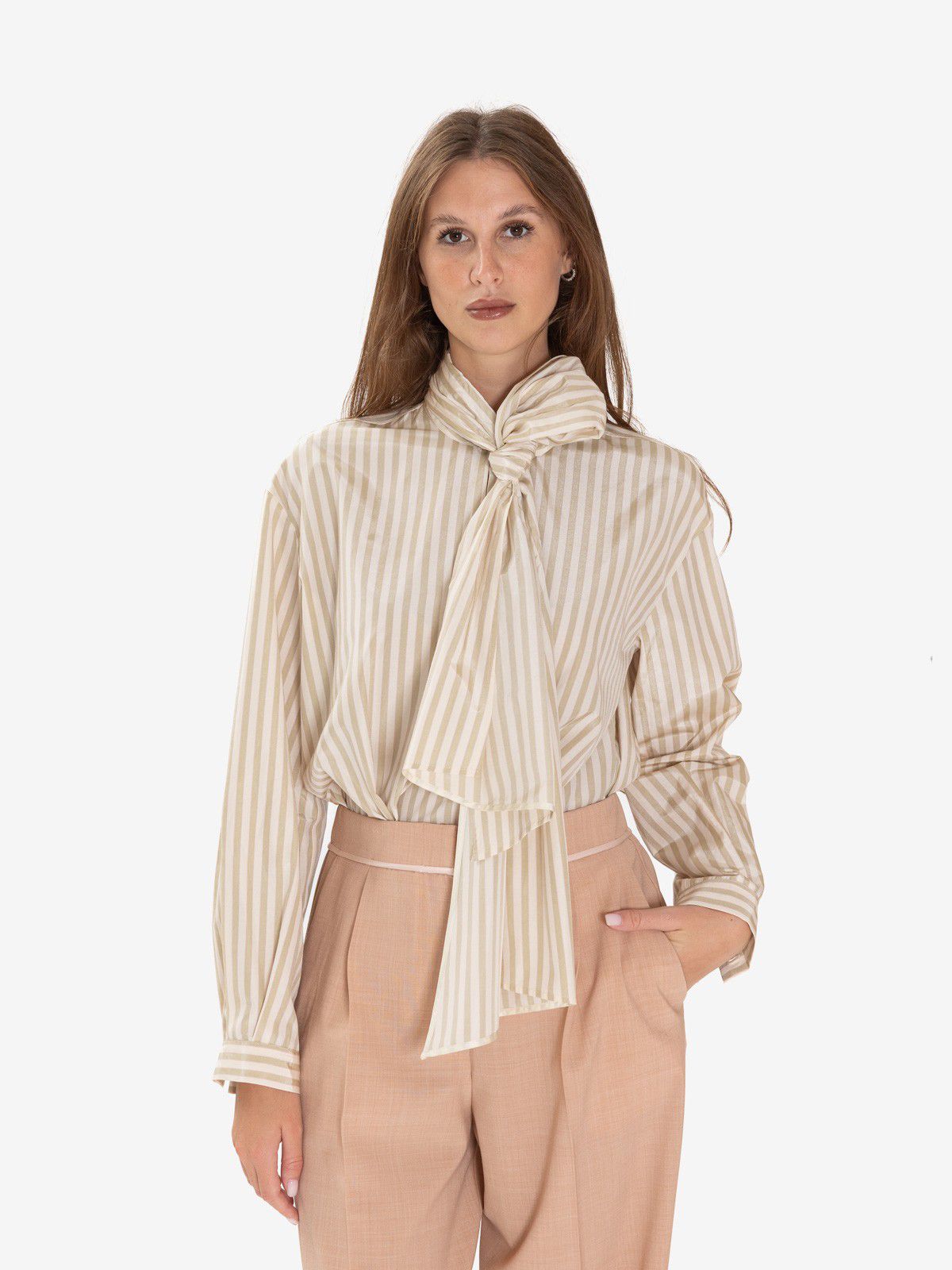 spalla scesa e un fresco motivo di righe riviera definiscono questa camicia in taffetà con motivo a righe e fiocco rimovibile. ampia nel volume oversize, gioca con la freschezza del tessuto e i suoi bagliori semi lucidi e le linee stondate e asimmetriche al fondo. piccolo nastro rimovibile da annodare al collo, modulando lo styling.