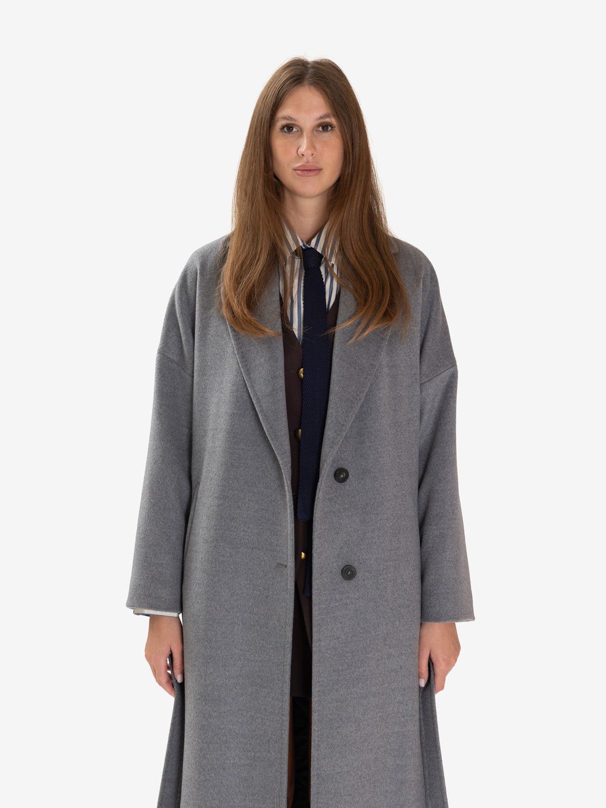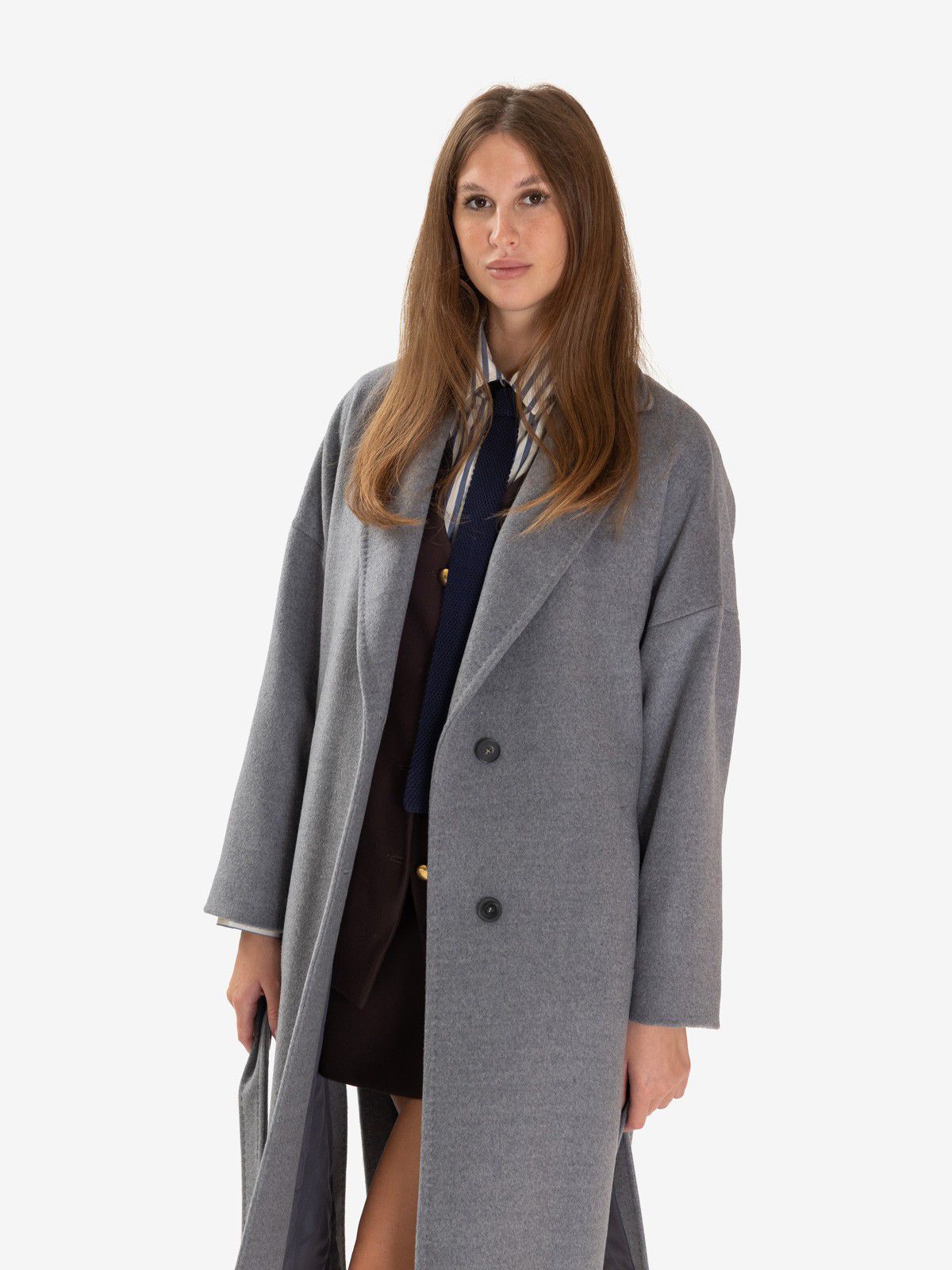 Cappotto lungo in lana grigio con cintura.