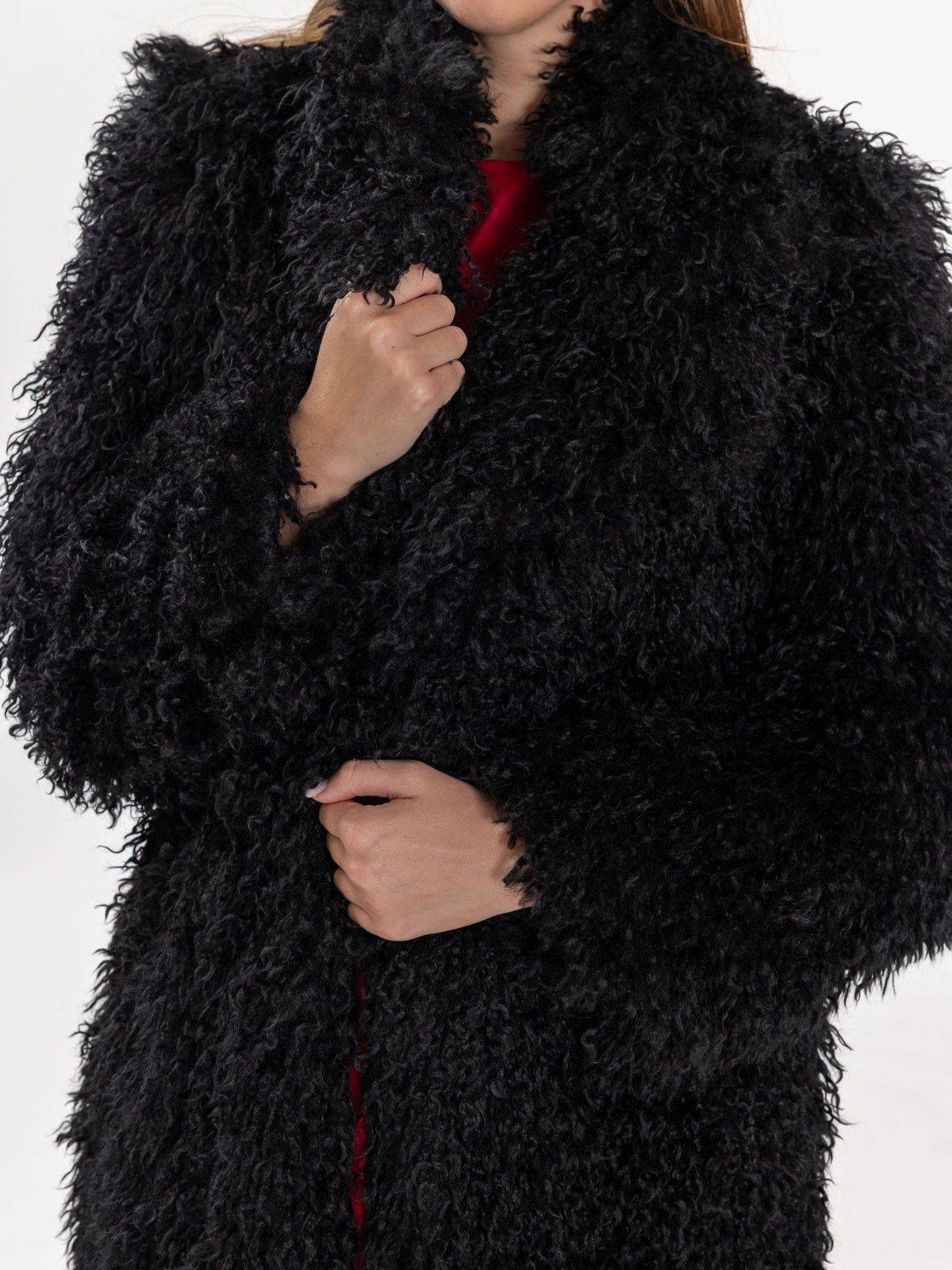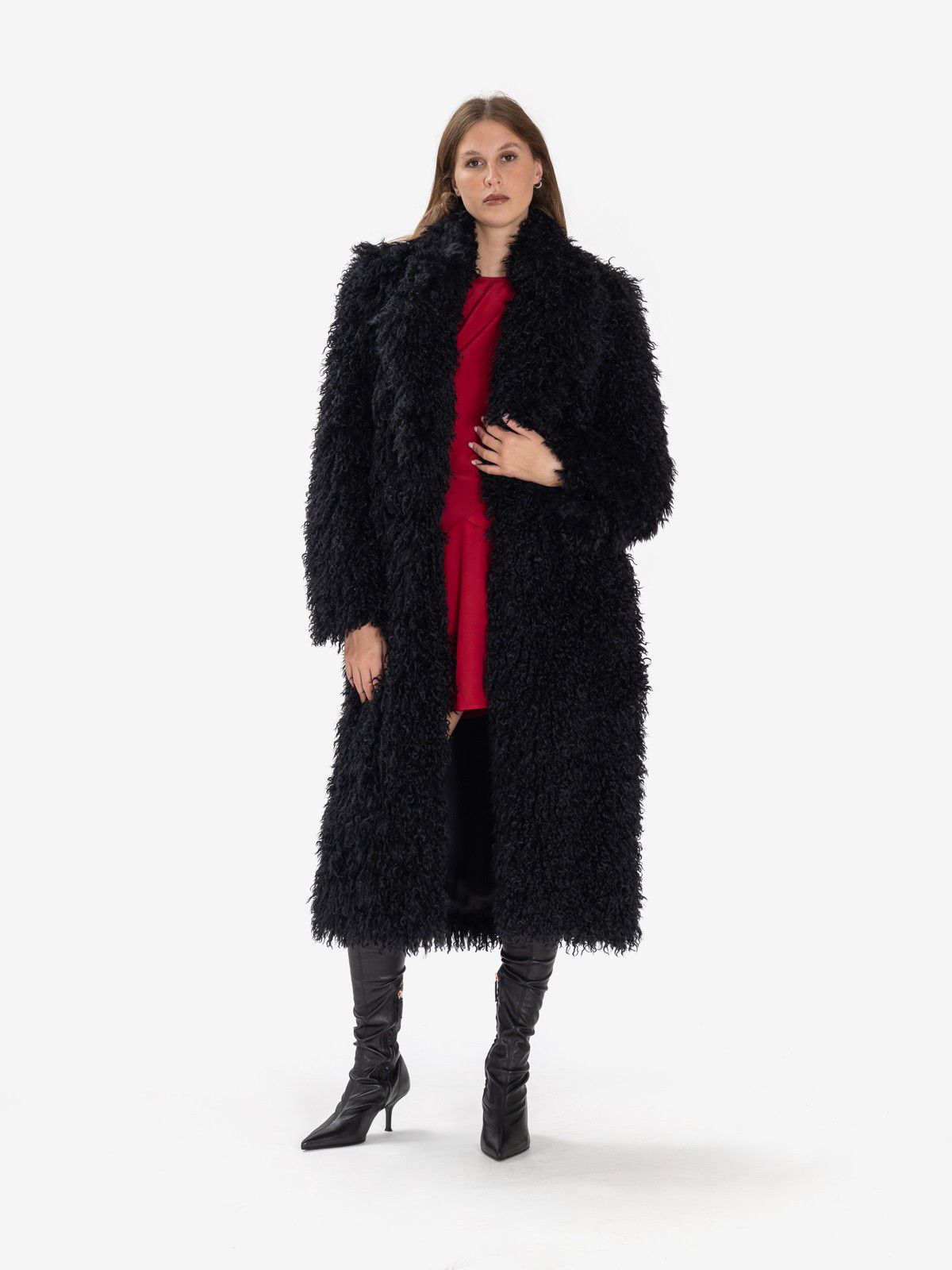Maxi cappotto lungo monopetto in ecopelliccia effetto mongolia. Il ricco collo e revers completano la linea di Calendula rendendolo un capo iconico, che valorizza ogni tipo di look. Chiusura con ganci e tasche nei fianchi.