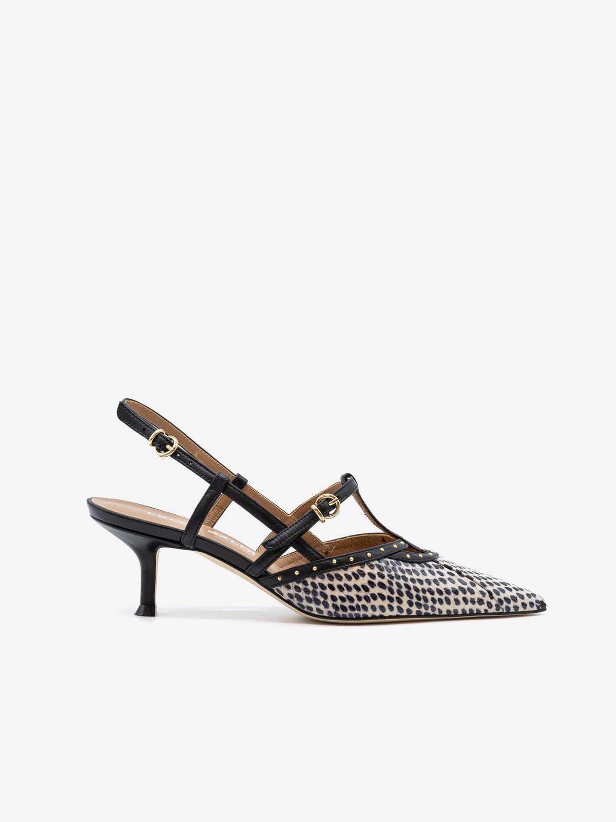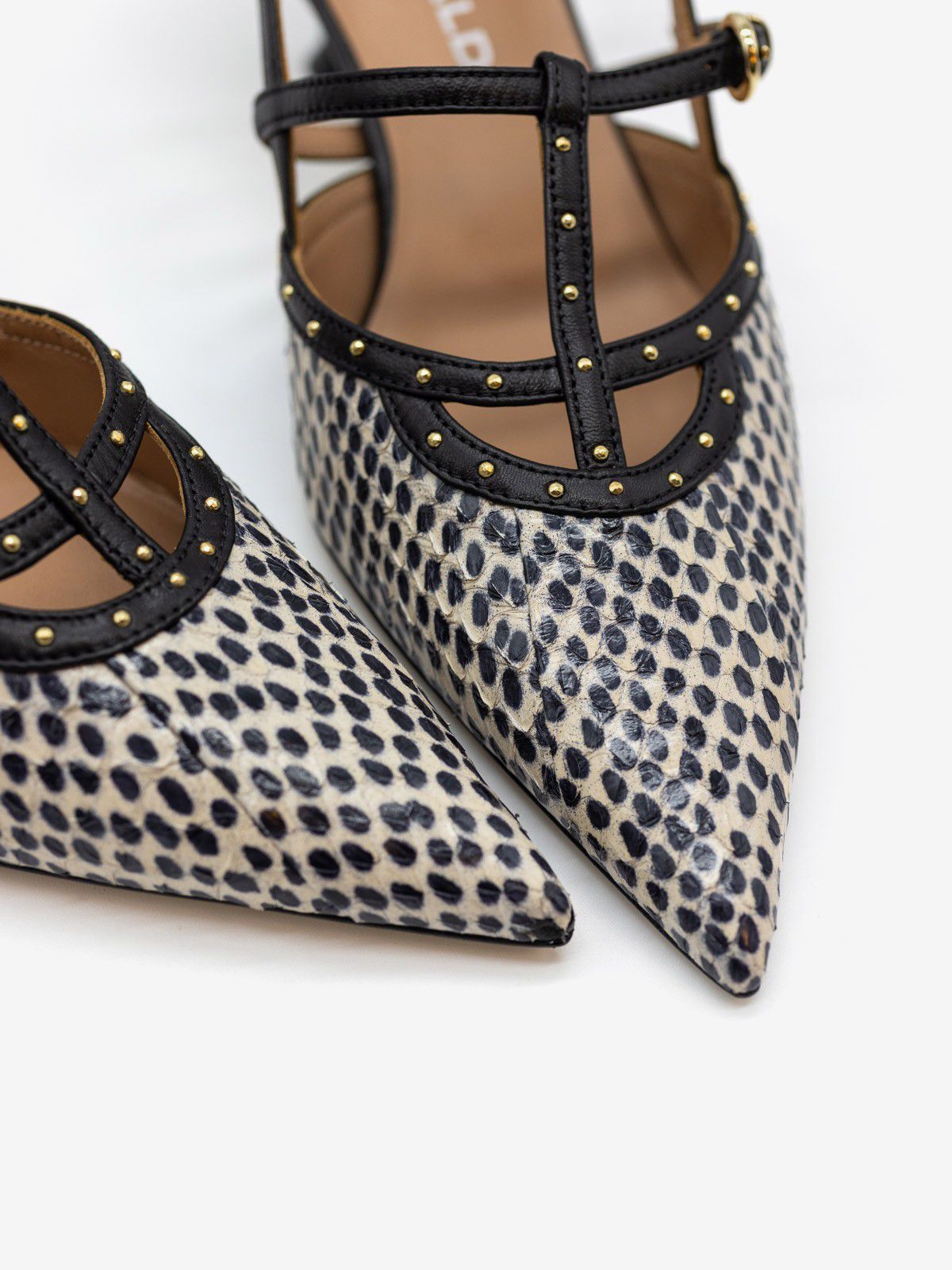 Slingback by LELLA BALDI in morbida pelle di colore nero. Punta chiusa con tomaia a pois e borchie e comodo cinturino alla caviglia. Suola in vero cuoio.