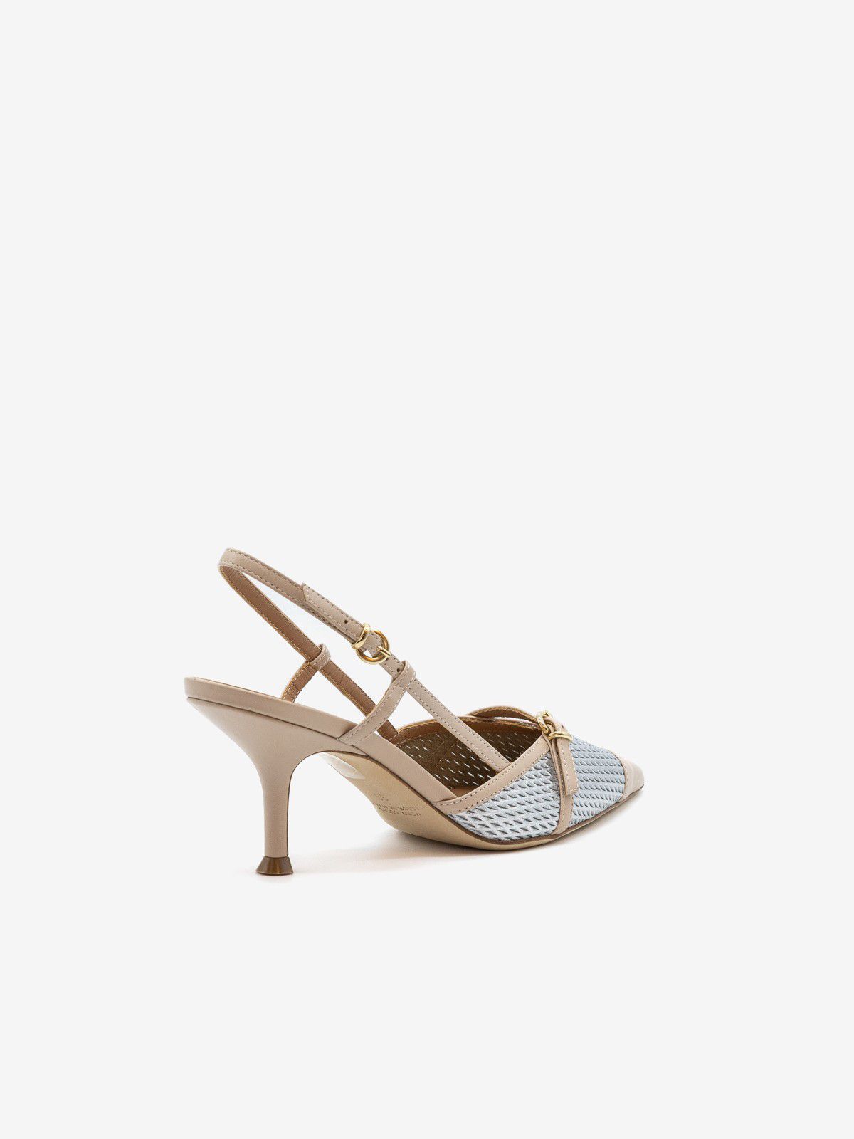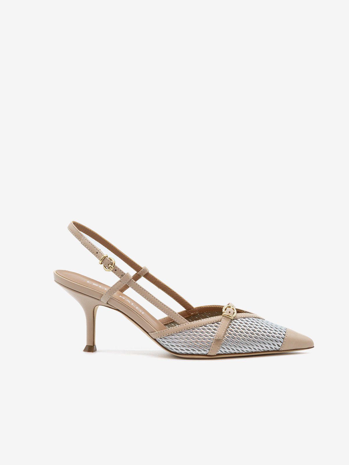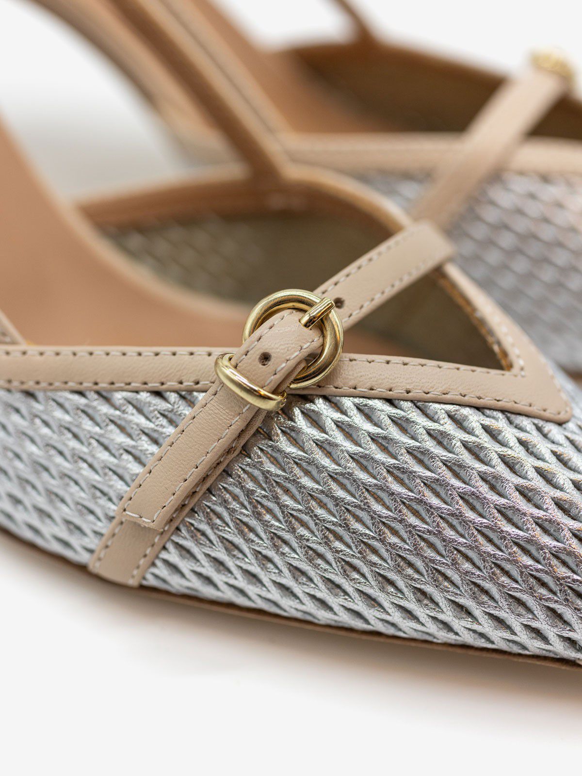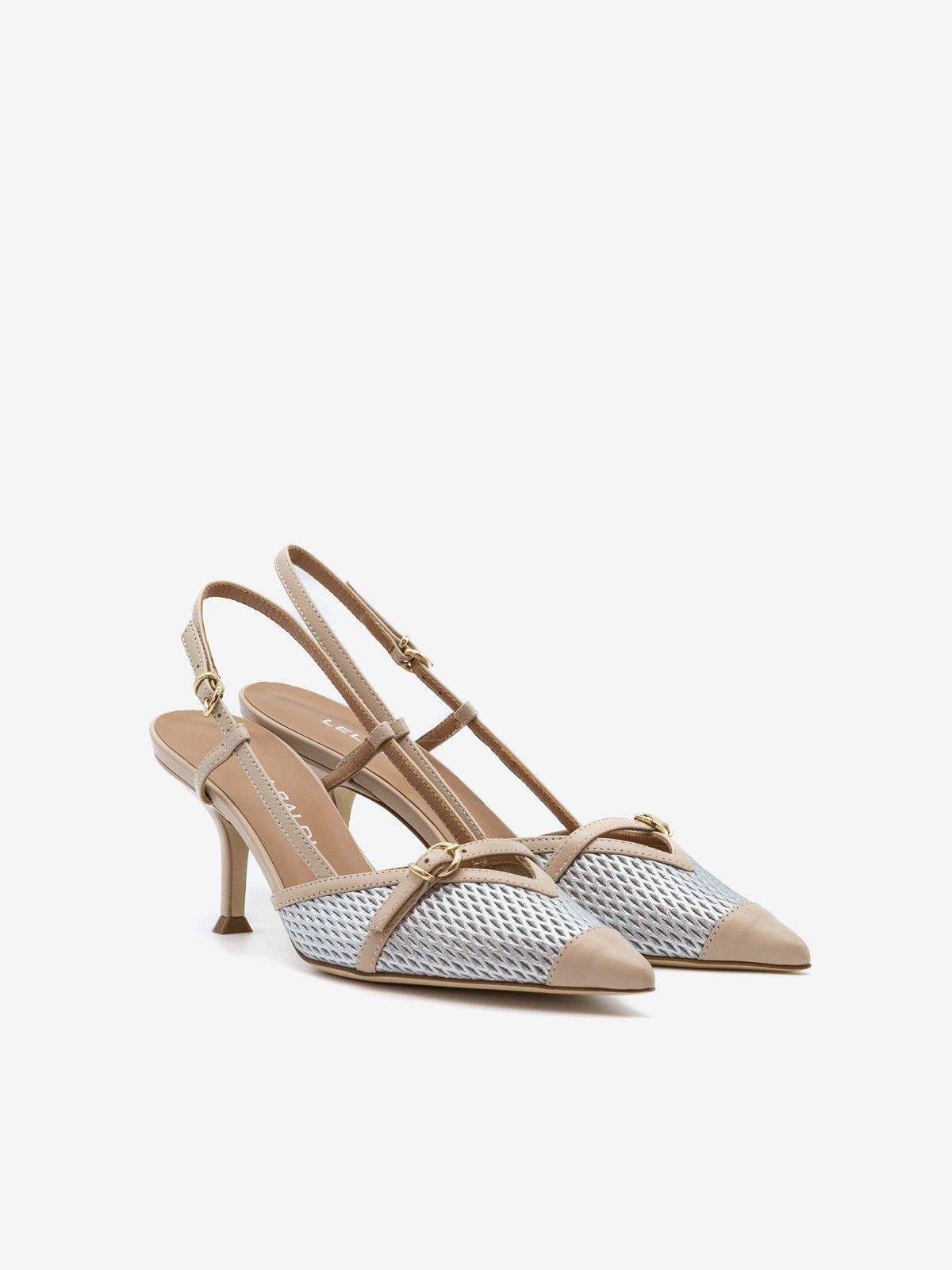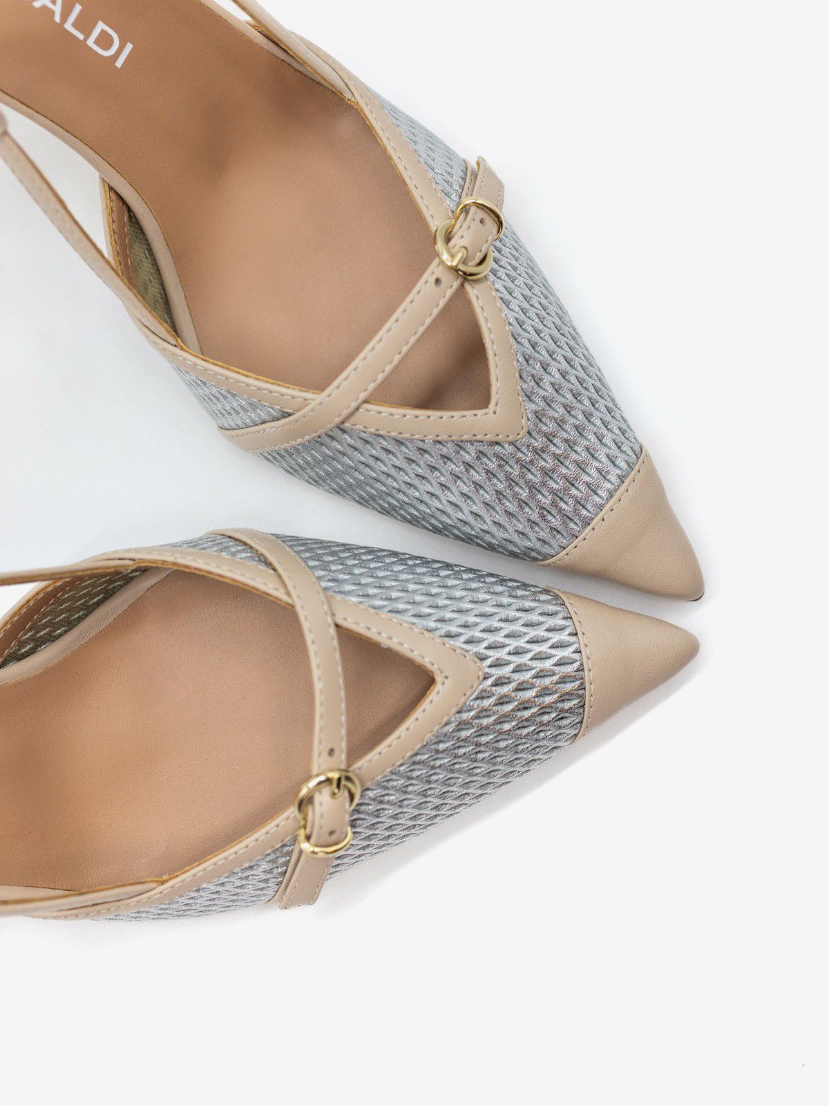 Slingback by LELLA BALDI in morbida pelle di colore argento/nude. Punta chiusa e comodo cinturino regolabile al tallone. Suola in vero cuoio.