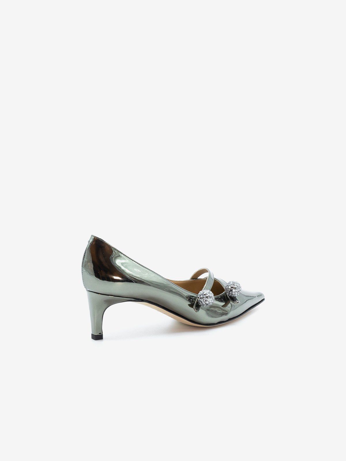 Scarpa in pelle specchio argento con bottoni gioiello, altezza tacco 5 cm.