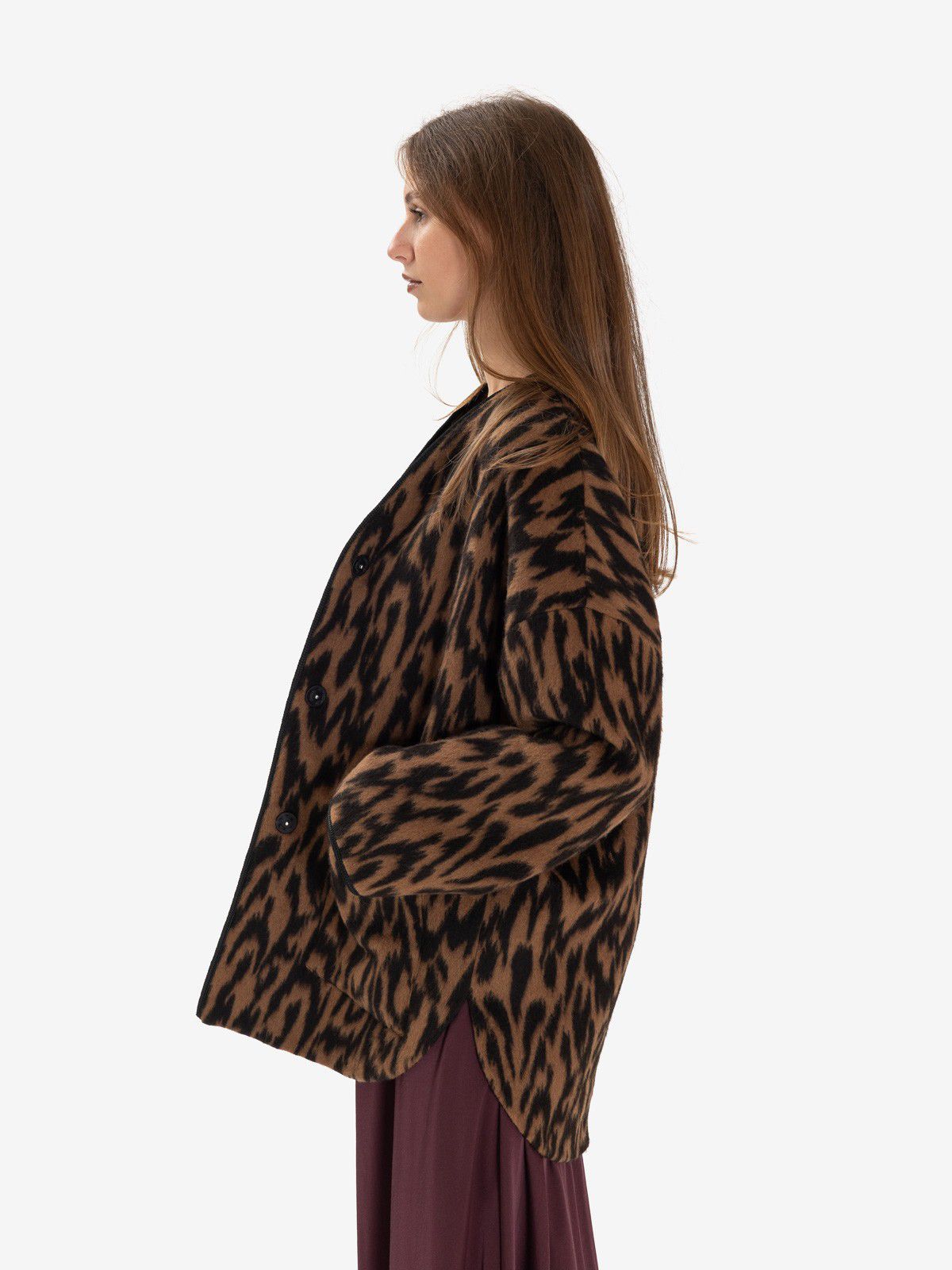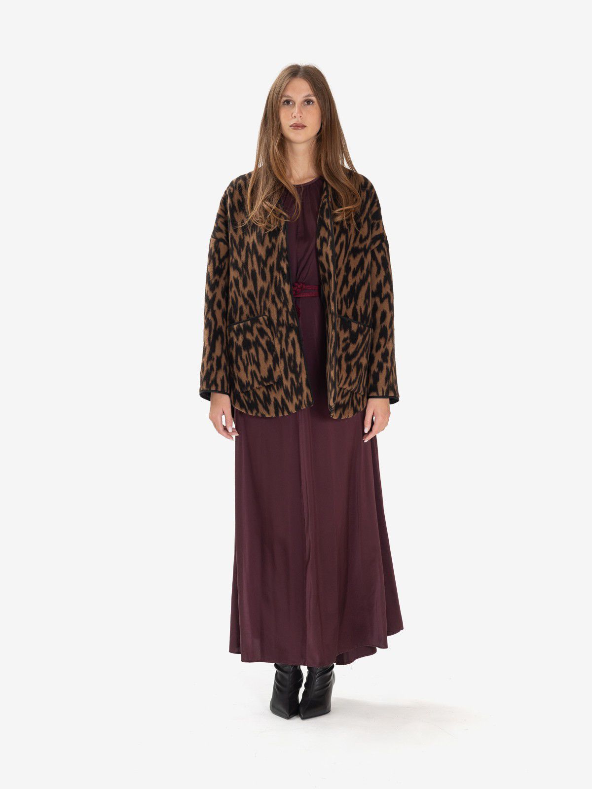 con le sue forme morbide e destrutturate, questo giaccone in panno jacquard “moiré” rimane in equilibrio tra il carattere deciso della fantasia e i volumi décontracté. i bordi in passamaneria a contrasto, il fondo asimmetrico con spacchetti stondati e la tasca applicata addolciscono l'importanza del panno in lana e cotone, con legatura in seta.
