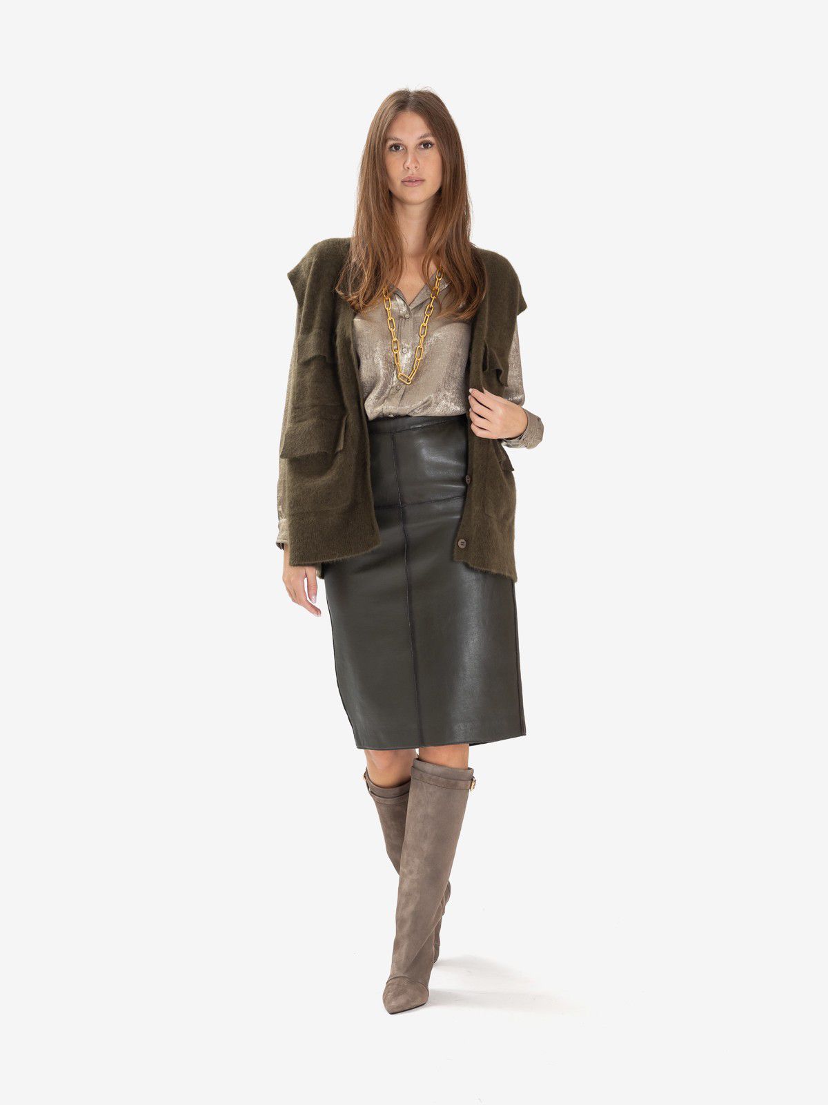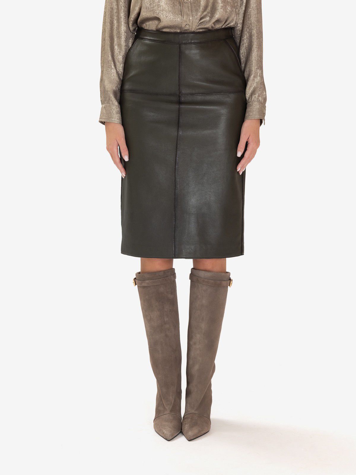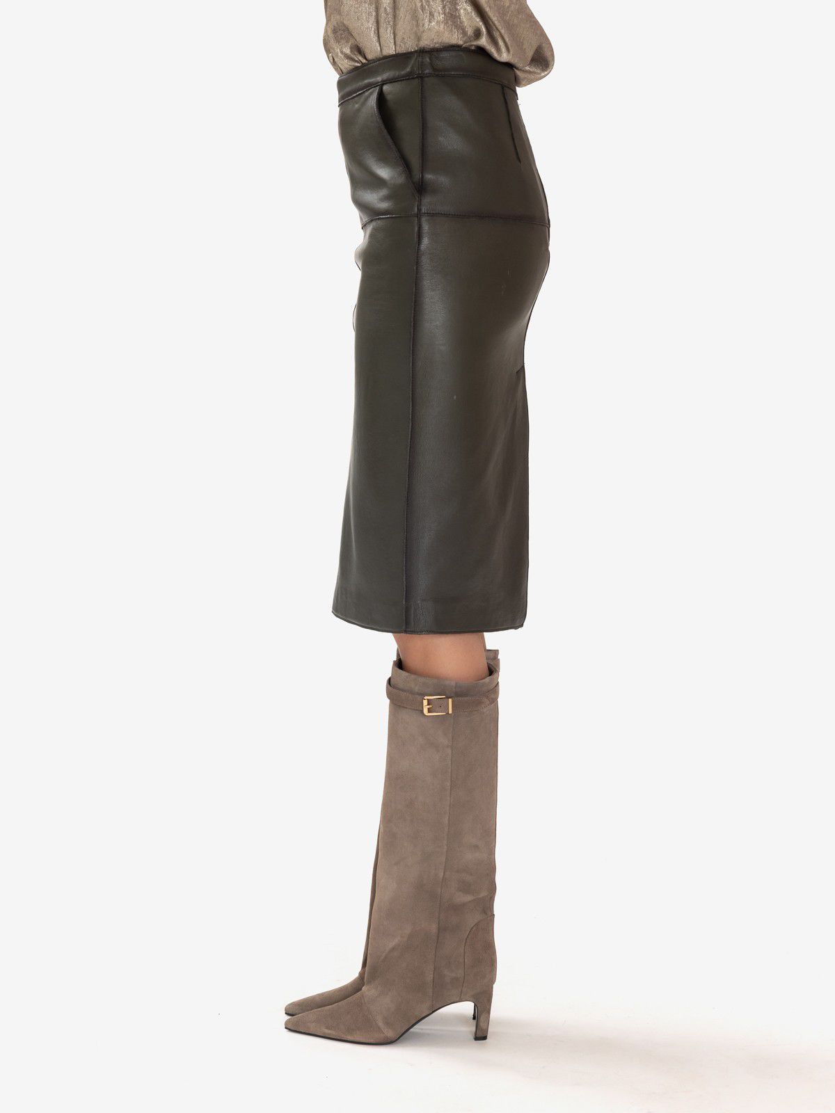 Gonna tubino in pelle verde oliva con spacco posteriore.