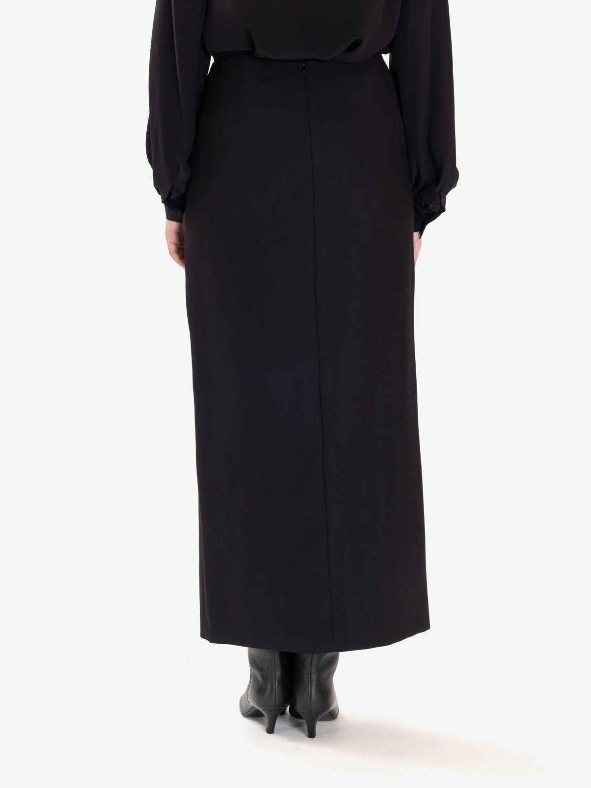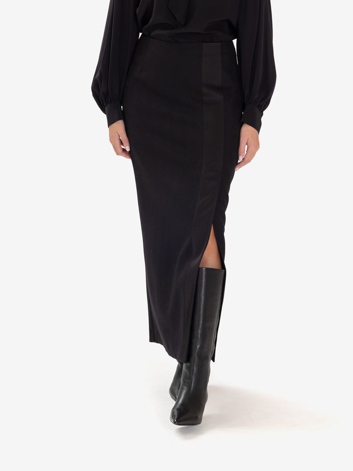 Gonna lunga a portafogli in chevron di lana e raso. Aria, con la sua linea pencil a portafogli, si caratterizza per il dettaglio tuxedo: una banda in raso riportata sul sormonto del potafogli che nasconde in raffinato spacco.