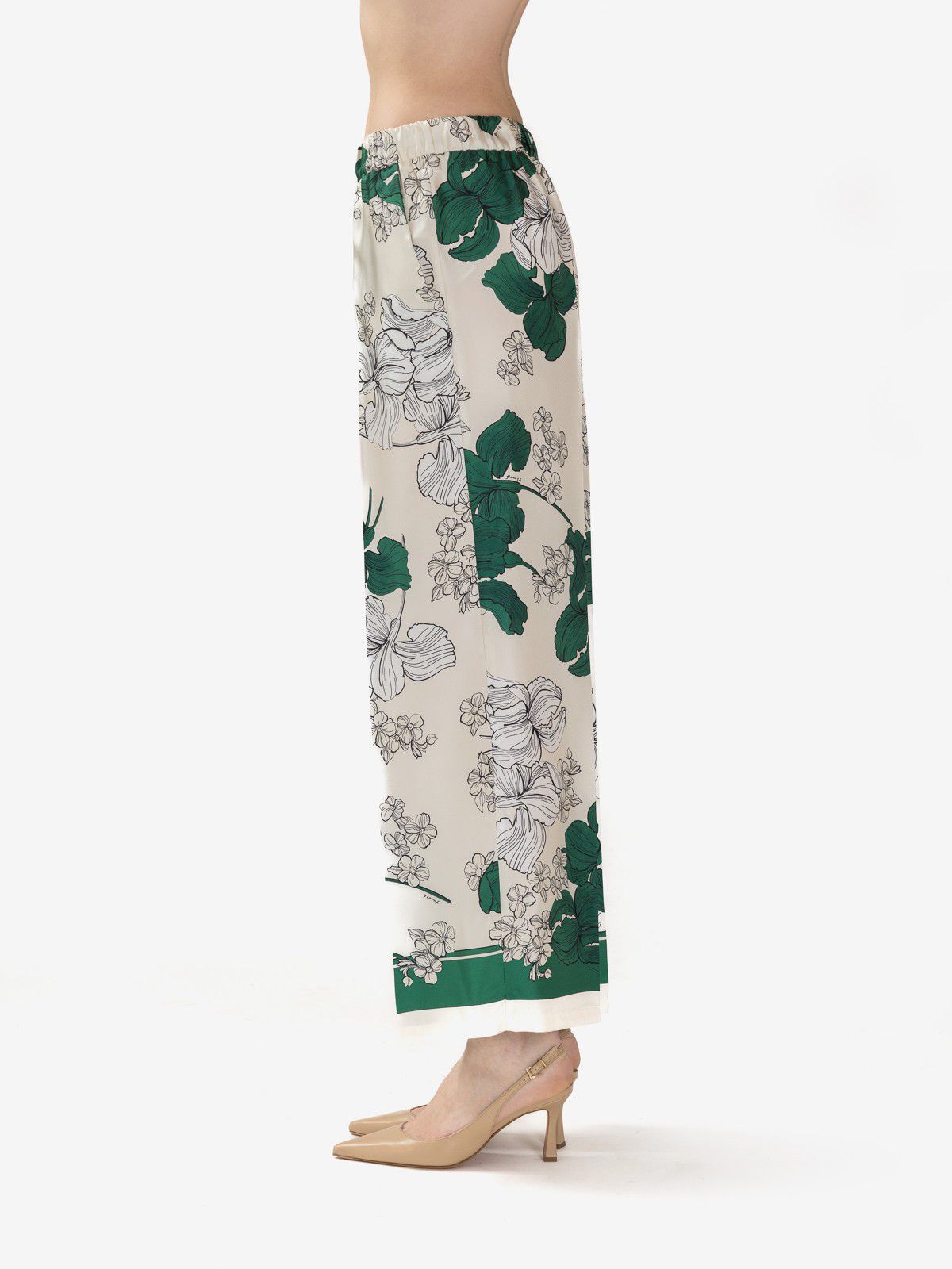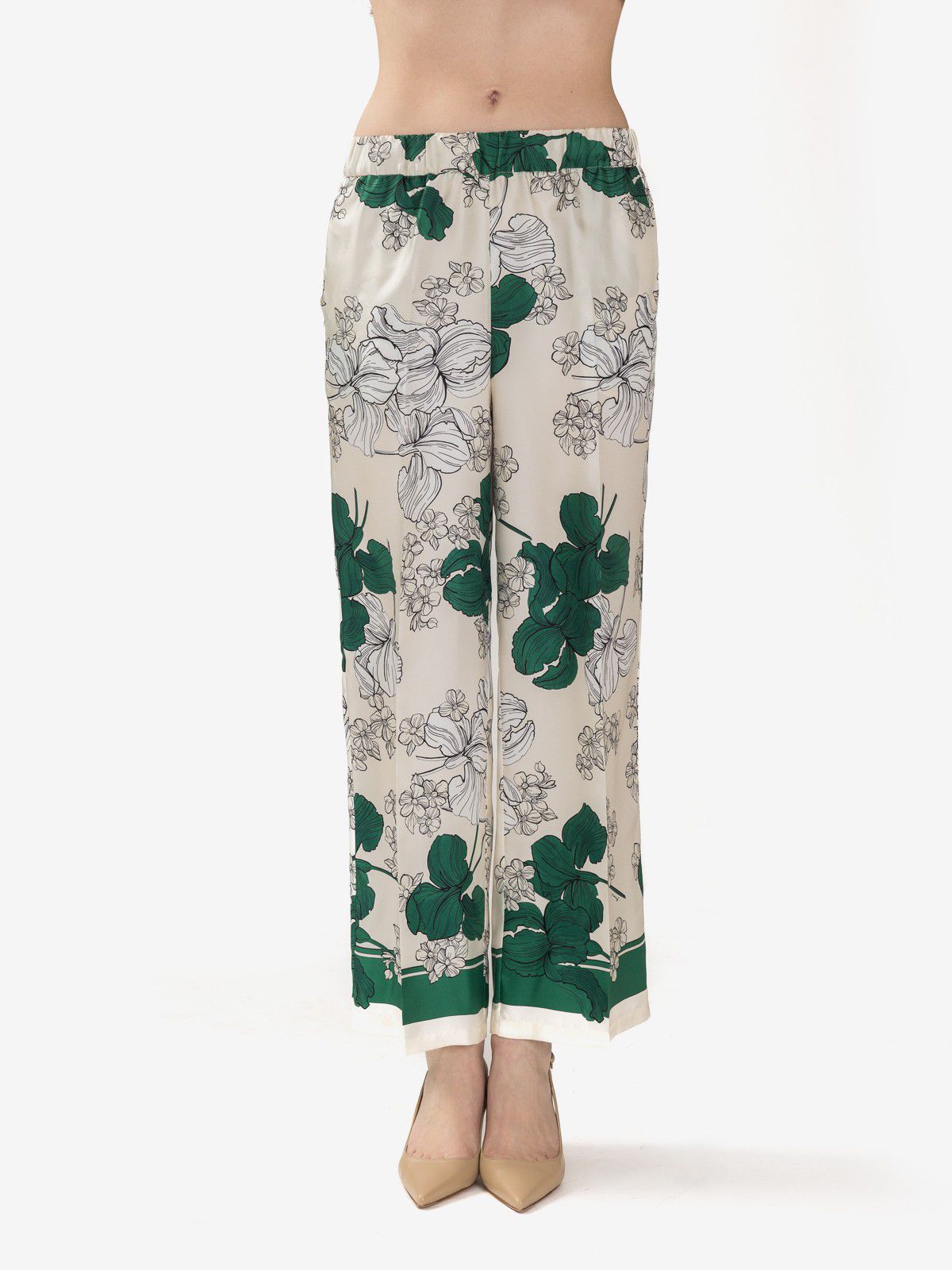 Pantalone palazzo in seta a fantasia fiori verde e panna.