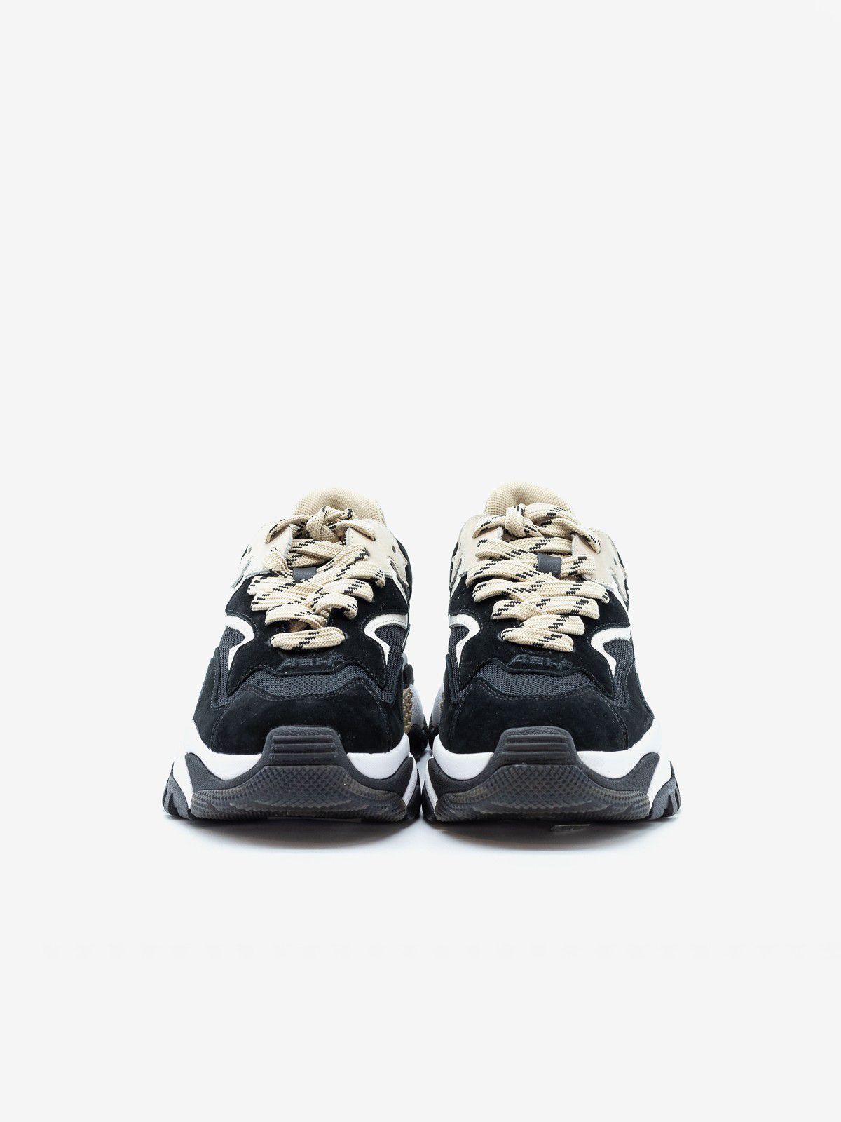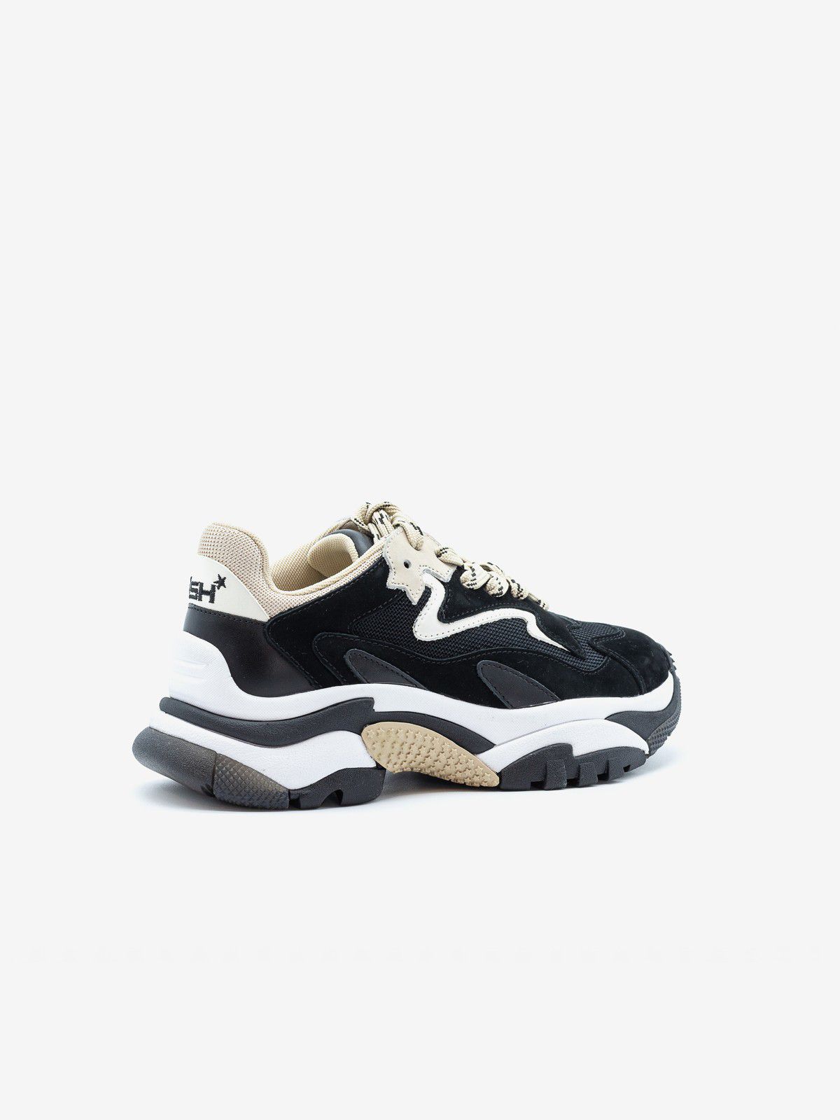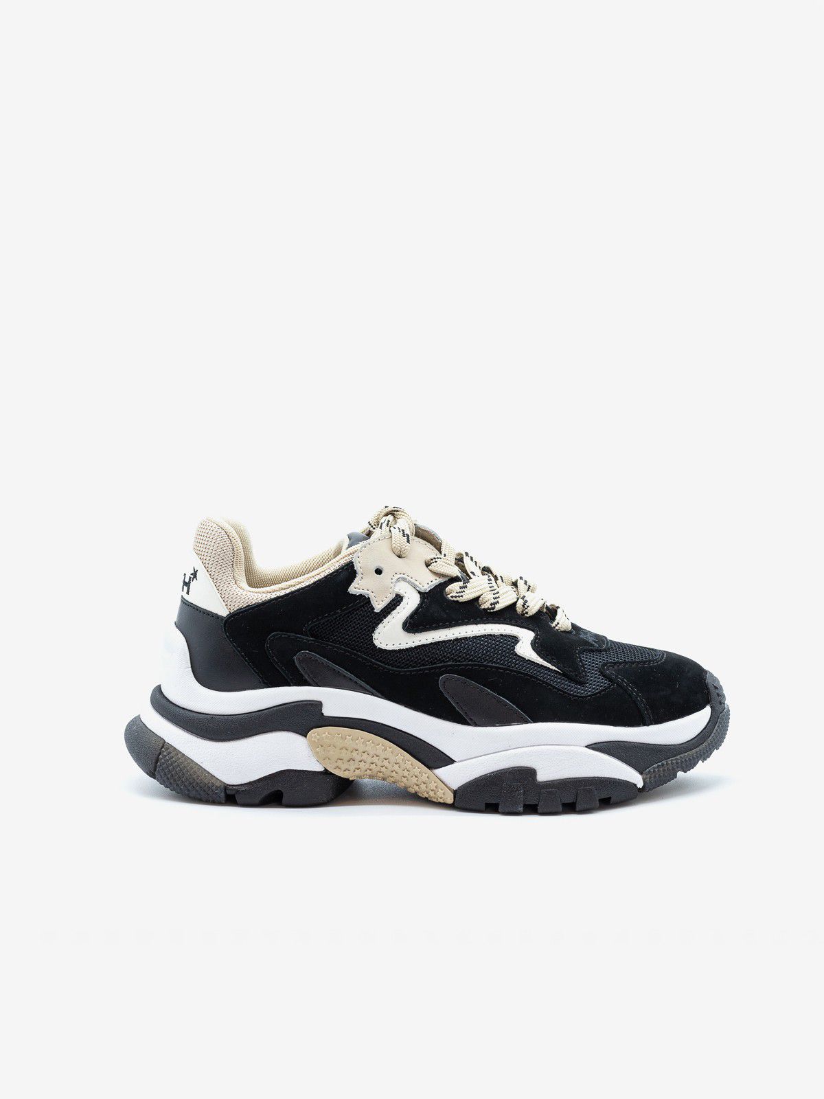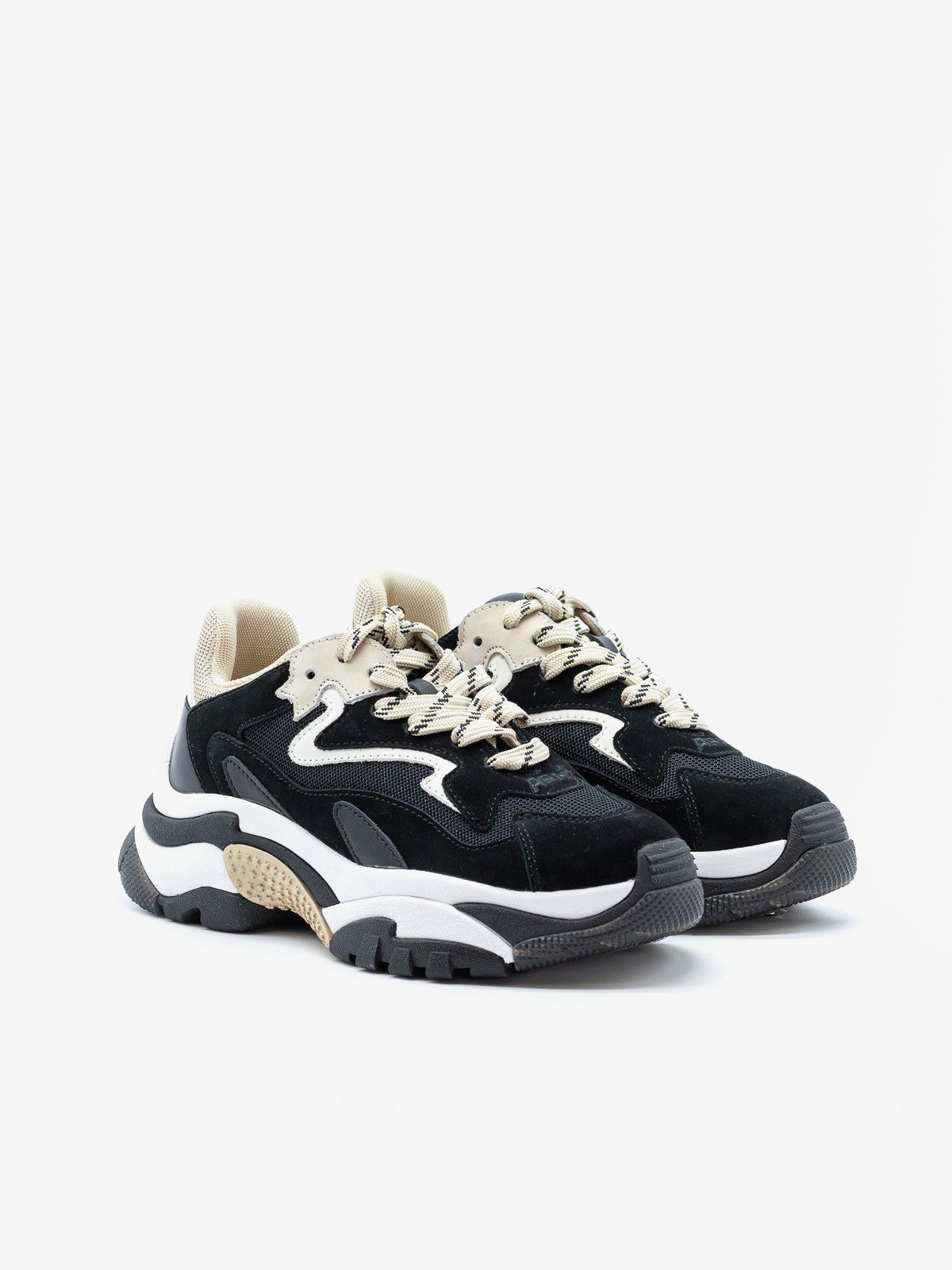 Sneaker stringata ADDICT by ASH in morbida pelle e tessuto. Inserti in pelle color beige, logo sul tallone in rilievo su inserto in camoscio e fondo in gomma extralight. La nuova sneaker di tendenza, la più amata tra le fashion addict.