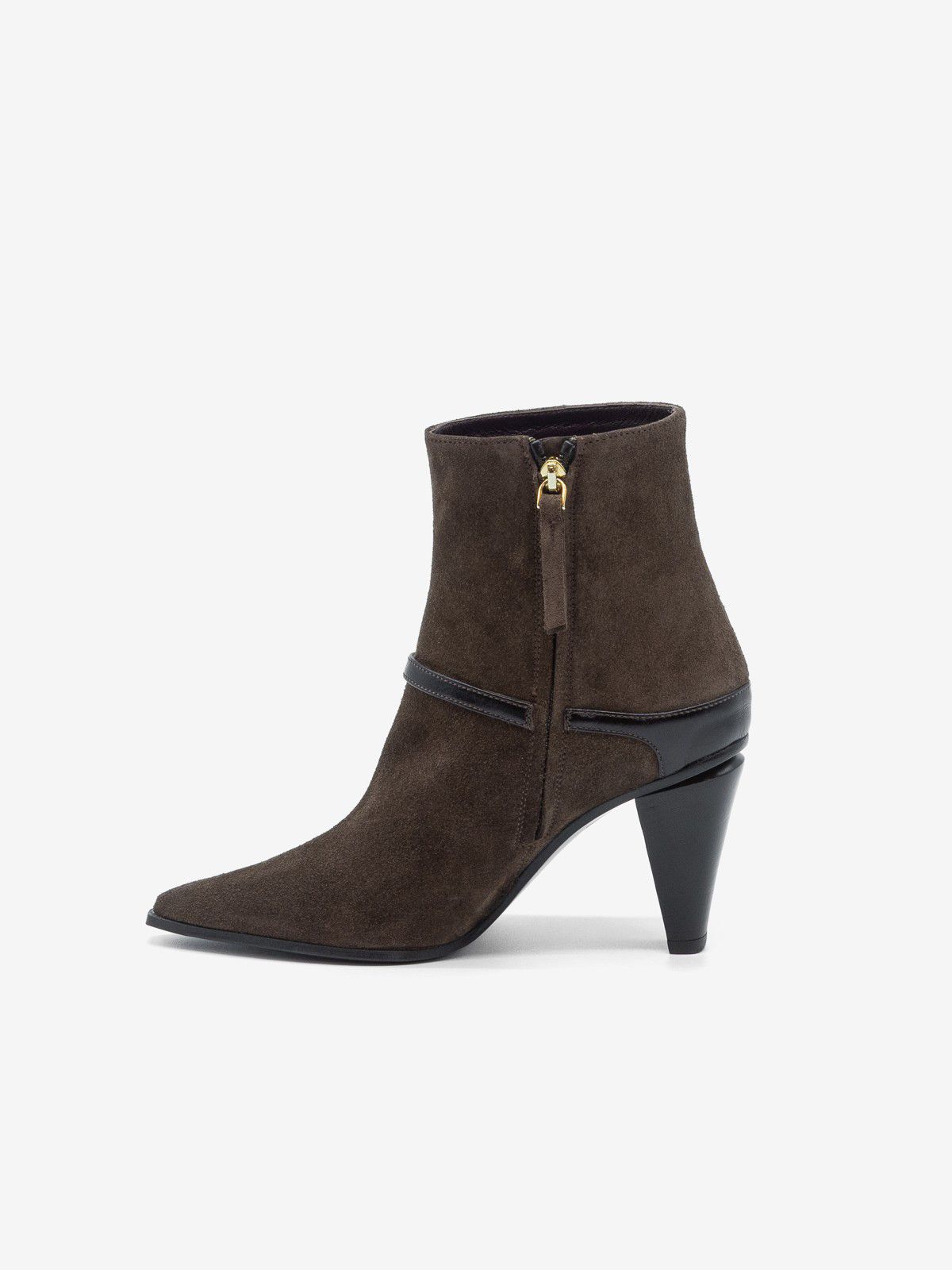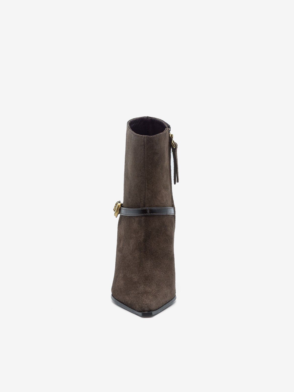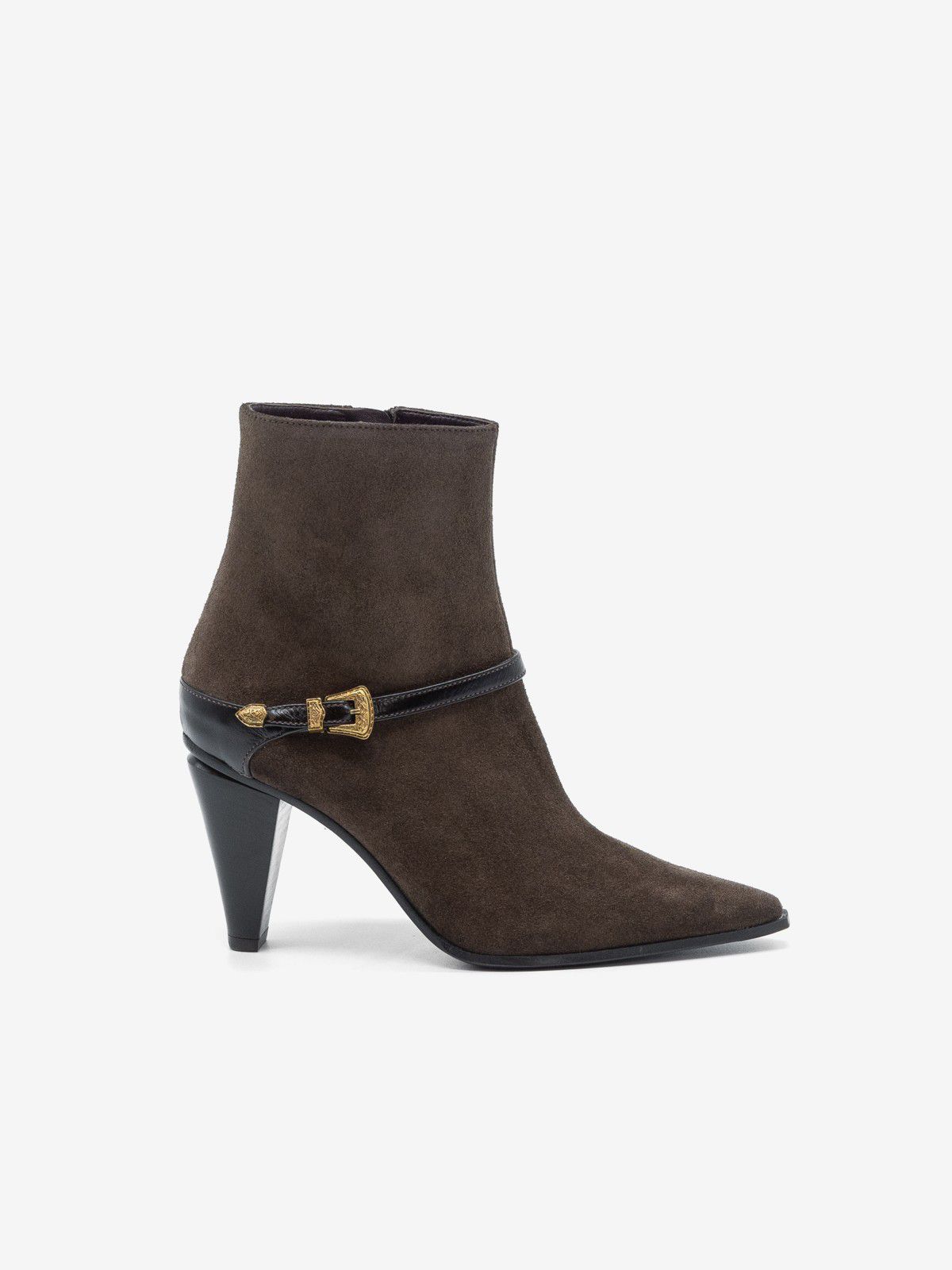 Modello texano su un tacco a cono di 8 cm realizzato in pelle scamosciata con una piccola fibbia texana dorata, sul collo del piede, chiusura con zip laterale. Tacco a cono, suola antiscivolo, vestibilità regolare.